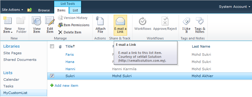 By default 'E-mail a Link' functionality for custom list item is no longer provided in SharePoint 2010. seMall Solution Email a Link for Custom List Item provides 'E-mail a Link' ribbon button to enable user to email a link to a list item in a custom list.
